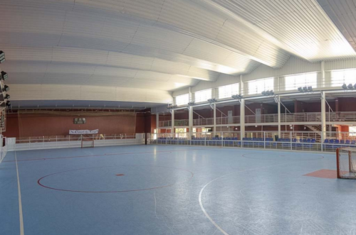 Polideportivo bien adaptado al deporte que allí se practica. (Hockey) con gradas y protectores para los espectadores.